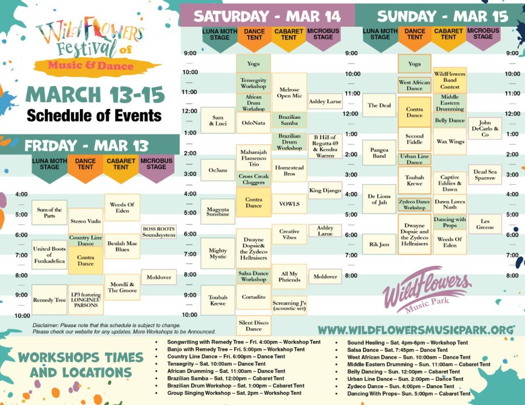 “Join us for a vibrant three-day celebration of music, dance, art, and community at the inaugural WildFlowers Music & Dance Festival! Nestled in the heart of North Florida, our 270-acre park offers a unique setting to connect with nature, explore creativity, and celebrate life together.